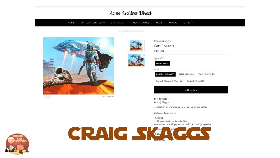 Join us for a live interview with Artist & Creator Craig Skaggs! Craig art is currently available at the Epcot International Festival of the Arts Acmearchives booth. Better Known as the “STAR WARS” Art booth. We’ll chat about his career, his art, and other interesting creations along the way. Hope you join us!
