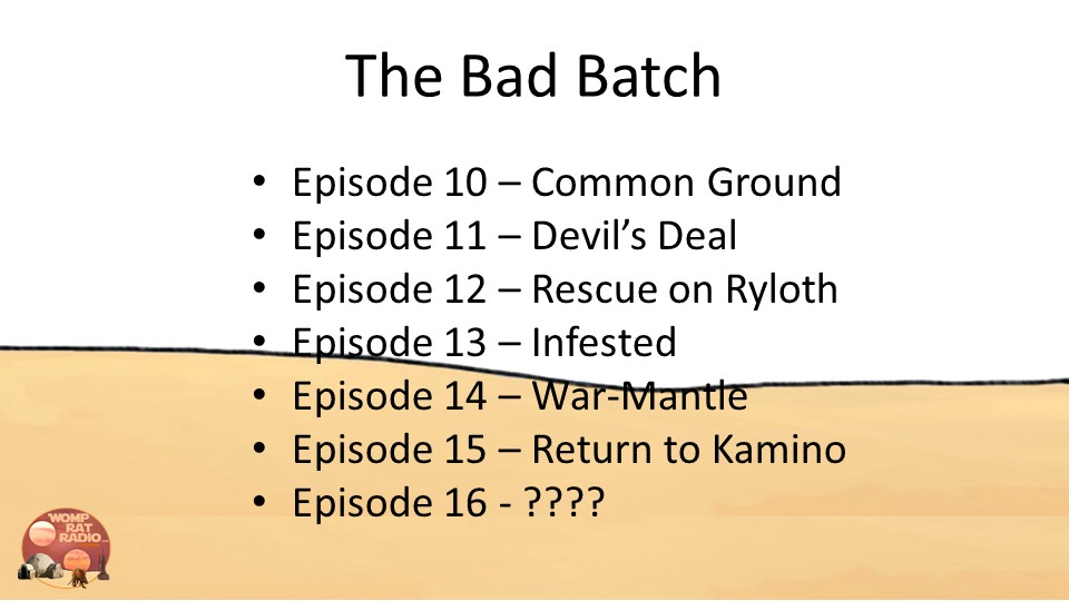 This time on WompRatRadio: We look back at some Easter eggs in the Bad Batch episode 10-15 ad speculate on what to expect in the Season One Finale. As always we talk Lego, News, Mandalorian and Tamagotchi
